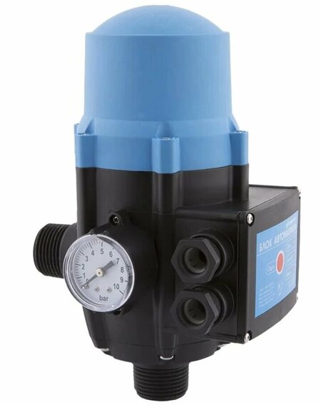 Блок автоматики «ДЖИЛЕКС» предназначен для автоматического регулирования работы насоса и защищает его в случае отсутствия воды (сухой ход). Помимо этого электроника запускает электронасос при снижении давления в системе, когда открываются краны, а также останавливает его, когда вода прекращает движение, когда краны закрываются. Блок автоматики комплектуется манометром, для зрительного контроля общего давления в системе, и реле давления. Технические характеристики блока управления насосом Давление, необходимое для запуска автоматики можно регулировать в диапазоне от 1,5 до 3,5 бар. Материалы из которых изготовлено изделие разрешены для контакта с питьевой водой. При работе с магистральным водопроводом, его напор воды складывается с напором создаваемым насосом, что позволяет увеличить мощность потока. Максимально разрешенное давление 10 бар. Температурный режим эксплуатации от +1 до + 35. Присоединительный размер 1 дюйм. Особенности установки и эксплуатации блока автоматики для насоса Монтируется строго вертикально. При первичном запуске электронасоса требуется заполнить систему водоснабжения водой. Если насос дважды отключился из-за «сухого хода», то запрещено запускать его принудительно. Прекращение работы автоматики регулируется уровнем давления в насосе. Для правильной работы устройства, необходимо, чтобы насос поддерживал давление не ниже 2,3 бара, при перекрытых кранах.