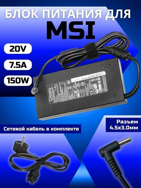 Блок питания для ноутбуков MSI мощностью 150ВТ, напряжением 20В и силой тока 7.5А, обеспечивает надежное и стабильное зарядное устройство для вашего ноутбука. Этот сетевой адаптер совместим с моделями MSI. Зарядка оснащена долговечным проводом оптимальной длины, что делает ее удобной в использовании. А штекер с разъемом разъем 4.5x3.0мм гарантирует точное подключение и эффективную зарядку. Зарядное устройство является универсальным решением для различных моделей ноутбуков MSI. защищая ваше устройство от перепадов напряжения и перегрева. Выбирая зарядное устройство именно в нашем магазине, вы получаете надежное и эффективное решение для поддержания работоспособности вашего ноутбука MSI, обеспечивая его бесперебойную работу и долговечность. Совместимые модели: MSI Creator M16 A11UC, A11UD, A12UC, A12UD, A12UEV, Katana GF76 11SC, 11UC, 11UD. 11UE, Katana GF76 Thin 11UE, Pulse GL66 11UCK, 11UDK, 11UEK. 11UGK, Pulse GL66 11UGKV, Stealth 15M A11UEK. Совместимые партномера: 8B2W1C20245, ADP-90FE D, S930406610D04, S93-0406610-D04, S930406611D04, S93-0406611-D04, S930406611MSK, S93-0406611-MSK. В совместимостях указаны не все модели, поэтому для уточнения напишите нам в вопросы, и мы обязательно поможем вам подобрать нужный блок питания для вашего ноутбука. Характеристики зарядного устройства: мощность устройства - 150W, выходное напряжение – 20V, сила тока 7.5А, разъем разъем 4.5x3.0мм. Все зарядные устройства комплектуются кабелем питания. Гарантия 12 месяцев.