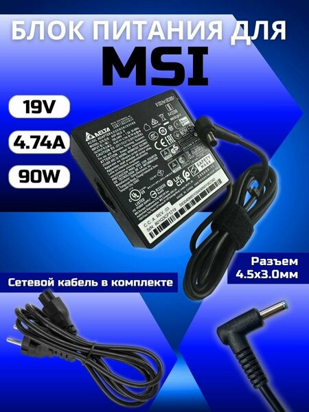 Блок питания для ноутбуков MSI мощностью 90ВТ, напряжением 19В и силой тока 4.74А, обеспечивает надежное и стабильное зарядное устройство для вашего ноутбука. Этот сетевой адаптер совместим с моделями MSI. Зарядка оснащена долговечным проводом оптимальной длины, что делает ее удобной в использовании. А штекер с разъемом разъем 4.5x3.0мм гарантирует точное подключение и эффективную зарядку. Зарядное устройство является универсальным решением для различных моделей ноутбуков MSI. защищая ваше устройство от перепадов напряжения и перегрева. Выбирая зарядное устройство именно в нашем магазине, вы получаете надежное и эффективное решение для поддержания работоспособности вашего ноутбука MSI, обеспечивая его бесперебойную работу и долговечность. Совместимые модели: MSI Modern 15 H B13M, 15 H AI C1MG, 15 H C13M, 14 H D13MG, 15 B12M, 15 B12HW, 15 A11SB, 14 B11SB. Совместимые партномера: ADP-90LE D. В совместимостях указаны не все модели, поэтому для уточнения напишите нам в вопросы, и мы обязательно поможем вам подобрать нужный блок питания для вашего ноутбука. Характеристики зарядного устройства: мощность устройства - 90W, выходное напряжение – 19V, сила тока 4.74А, разъем разъем 4.5x3.0мм. Все зарядные устройства комплектуются кабелем питания. Гарантия 12 месяцев.