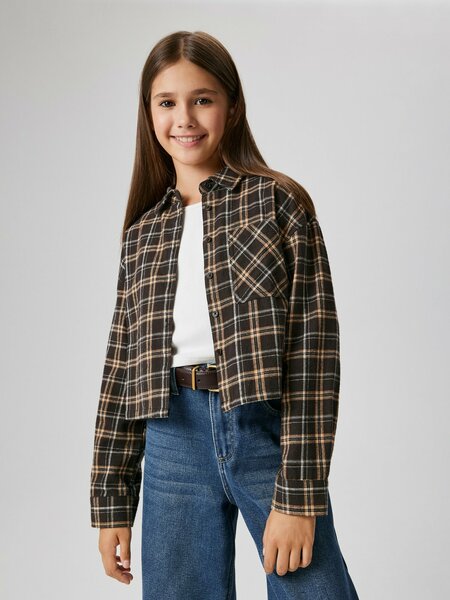 Детская укороченная рубашка в клетку для девочки выполнена из мягкой и дышащей ткани, которая обеспечивает комфортное ношение на протяжении всего дня. Модель прямого силуэта с приспущенной линией плеча обеспечивает удобную посадку на разные типы фигуры. Спереди расположена застежка на петли и брендированные пуговицы. Длинные рукава с манжетами на пуговицах делают модель подходящей для прохладной погоды. Практичный накладной карман на груди вносит легкий акцент в образ. Спинка с формообразующей кокеткой. Воротник придает модели завершенный строгий вид. Укороченная клетчатая рубашка составит отличный и стильный повседневный образ с белой футболкой и джинсами с высокой посадкой. 20210260143 20210260143
