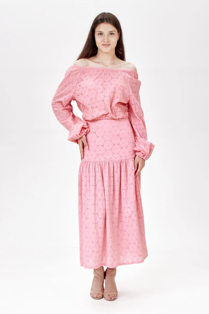 Укороченная блуза с цветочным перфорированным узором и длинными рукавами фонариками с манжетами на резинках. Модель можно носить как с закрытыми, так и с открытыми плечами. Для создания комплекта сочетайте с соответствующей юбкой в тон.
