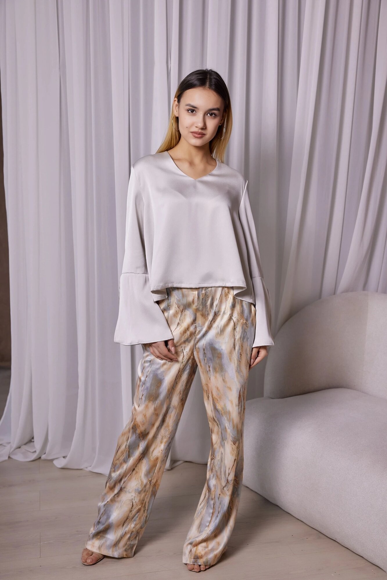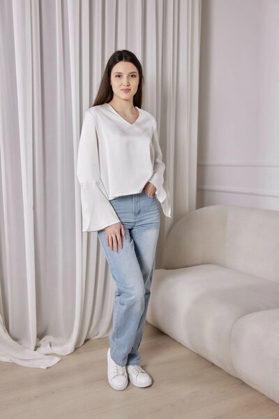Элегантная укороченная блуза с глубоким V-образным вырезом, приспущенной линией плеча и широкими расклешенными манжетами. Лаконичная модель, которая привнесет в образ комфорт женственность.