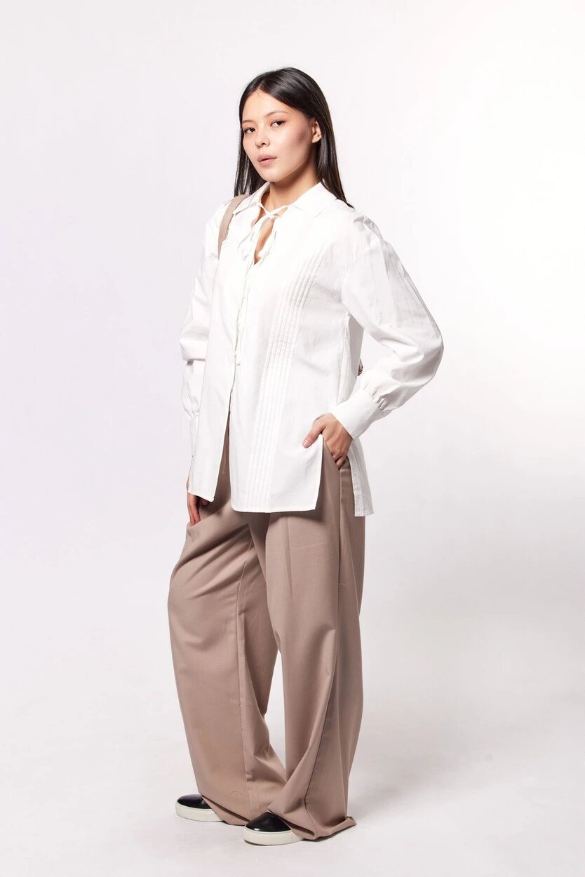 Лаконичная блуза прямого свободного кроя с рукавами-буфами, дополненная завязкой и застежкой на воздушные петли. Модель, с которой можно создать как офисный, так и вечерний образ.