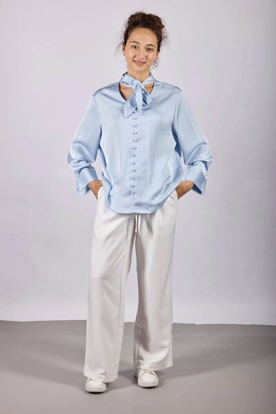Элегантная блузка из сатина с завязкой на шее — изысканная модель, которая придаст образу утончённость и роскошь. Мягкий блеск ткани и стильная деталь на шее создают женственный и современный вид, идеально подходящий как для вечерних выходов, так и для офисных луков.