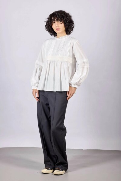 Блузка с рукавами-фонариками и ажурными вставками, расклешённая по низу, — утончённая и стильная модель, которая добавит лёгкости и романтичности в любой образ. Идеально подходит для создания элегантных и женственных луков, сочетая в себе как современный стиль, так и классические элементы.