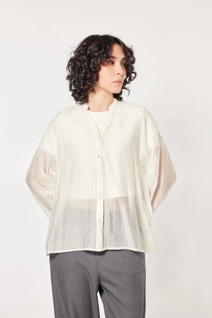 Элегантная прозрачная блузка прямого свободного кроя. Идеально подходит как для повседневных, так и для вечерних выходов. Сочетается с юбками, брюками или джинсами.