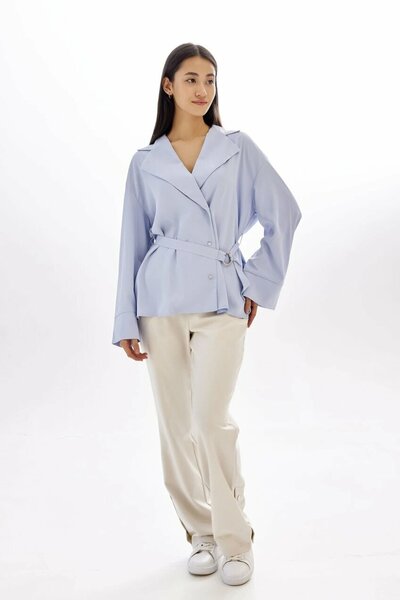 Эффектная рубашка на запах с лацканом и поясом в тон. Модель имеет V-вырез и хорошо вписывается в любые образы, от расслабленных — с легинсами и джинсами, до формальных — с брюками.