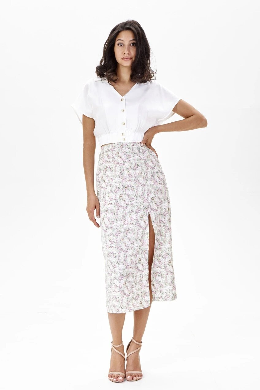 Укороченная блуза с глубоким V-образным вырезом и рукавами крылышками. Нижний край на широкой эластичной резинке придает модели комфортную посадку. Отлично будет сочетаться с брюками, джинсами и шортами.