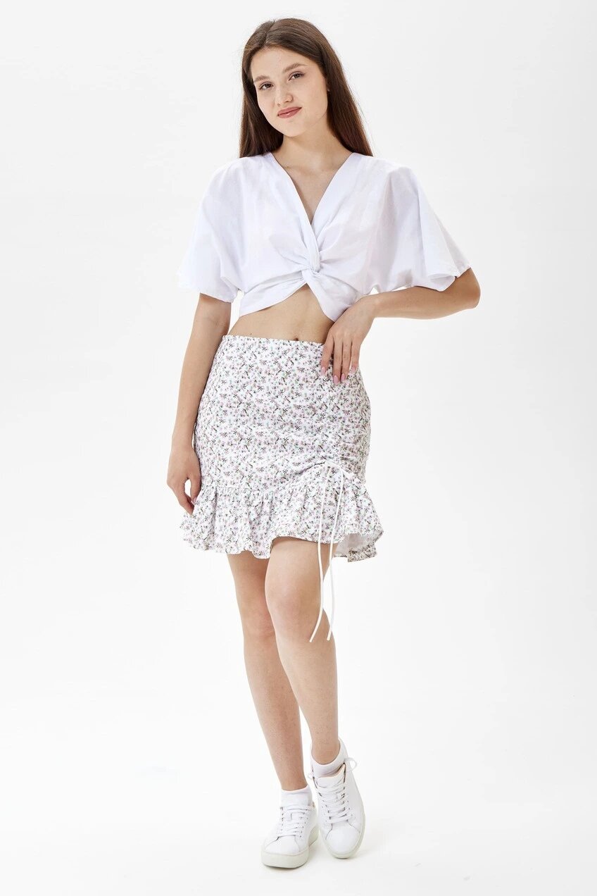 Укороченная блузка с V-образным вырезом и экстравагантной драпировкой спереди. Создавайте с моделью легкие женственные образы на отдых или летнюю повседневную прогулку.