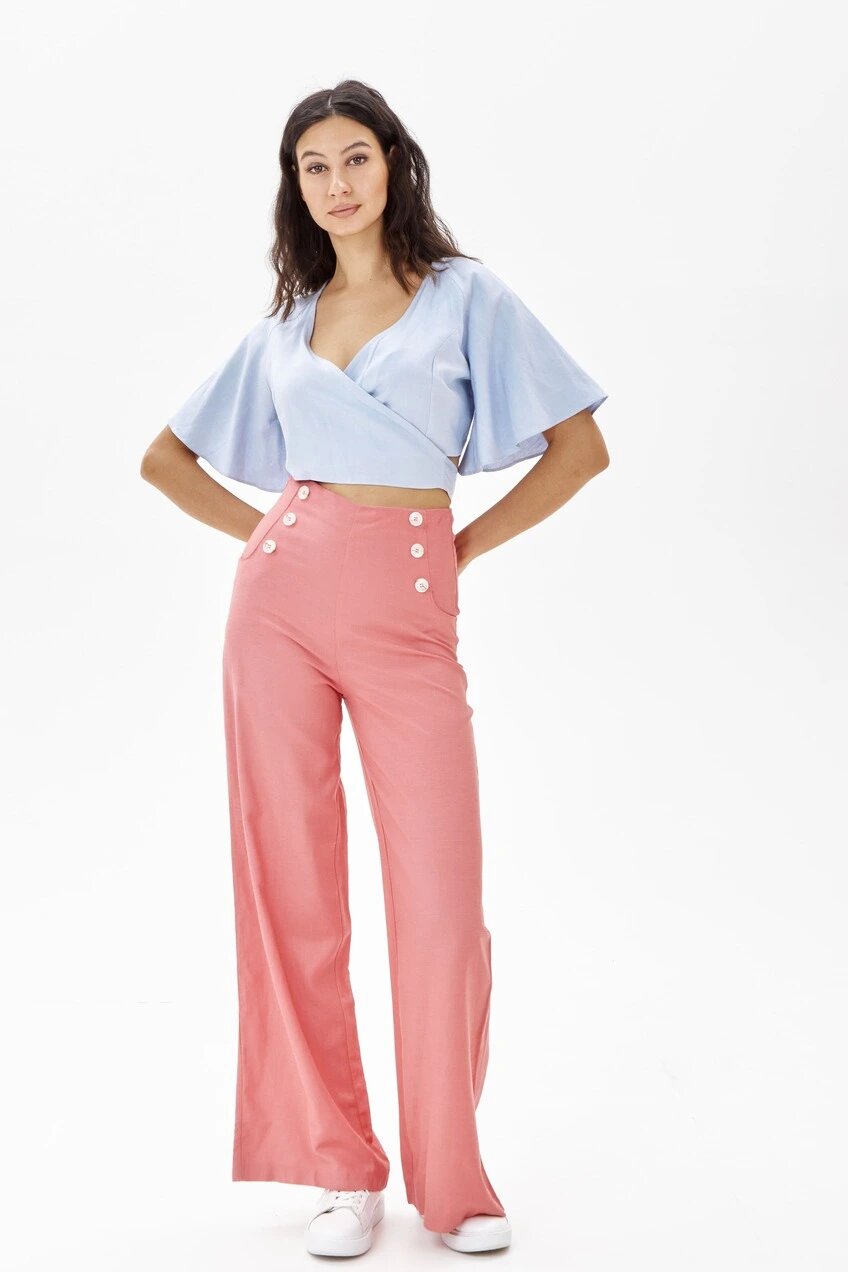 Укороченная блузка на запах с глубоким V-образным вырезом и расклешенными короткими рукавами. Легко создавайте женственные летние образы в сочетании с джинсами, юбками, брюками и шортами.