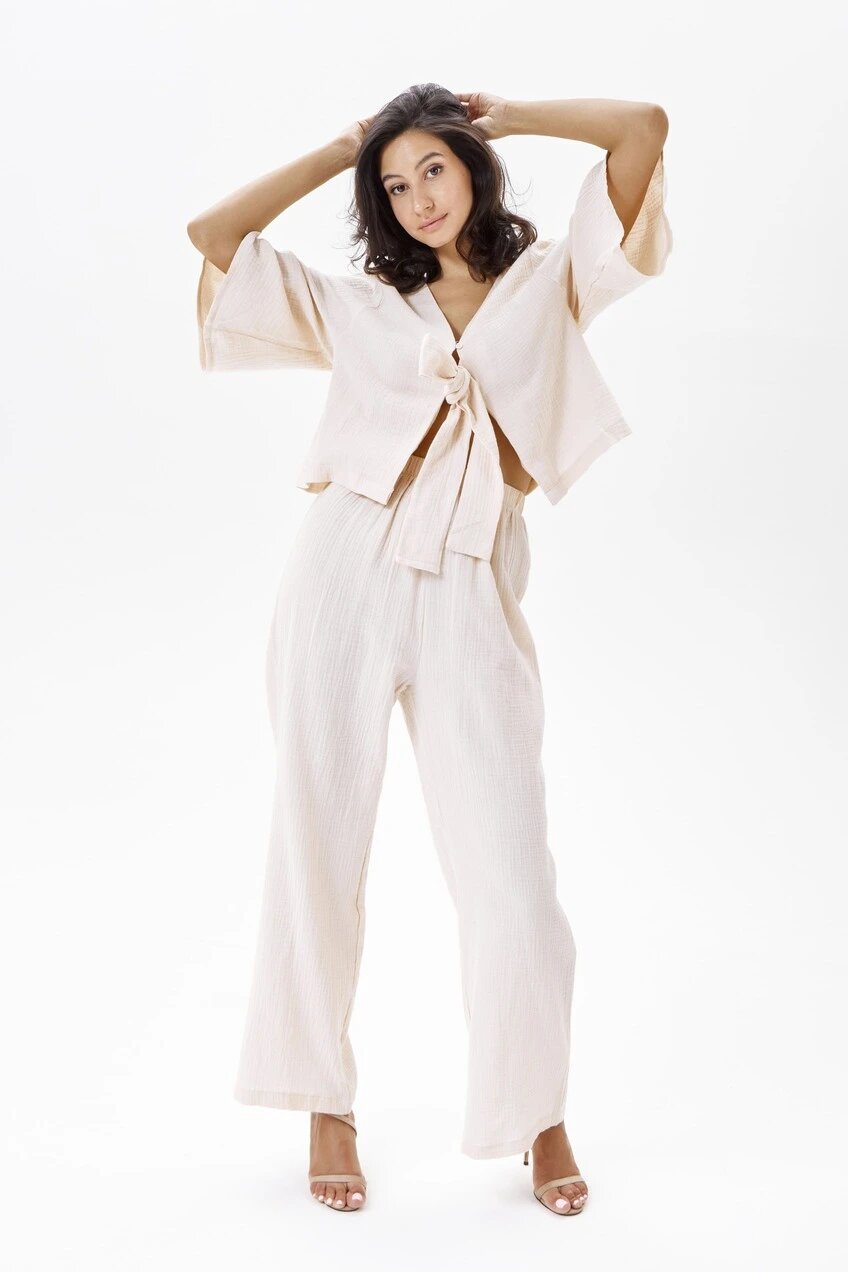 Укороченная блузка с широкой ленточной завязкой из основного материала. Имеет глубокий V-образный вырез и широкие рукава 3/4. Дополнительная застежка на воздушную петлю.
