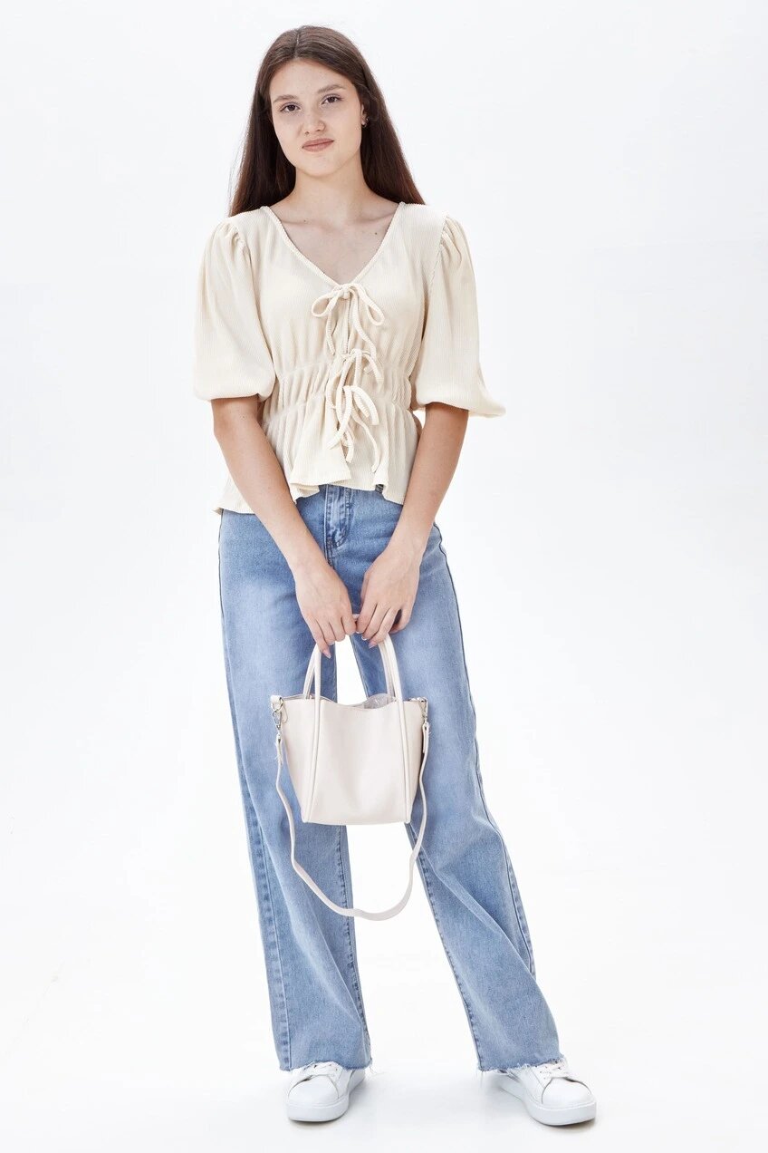 Нежная блуза с глубоким V-образным вырезом и короткими рукавами фонариками. Имеет застежку на три веревочные завязки. Хорошо сочетать модель с джинсами, брюками и шортами.