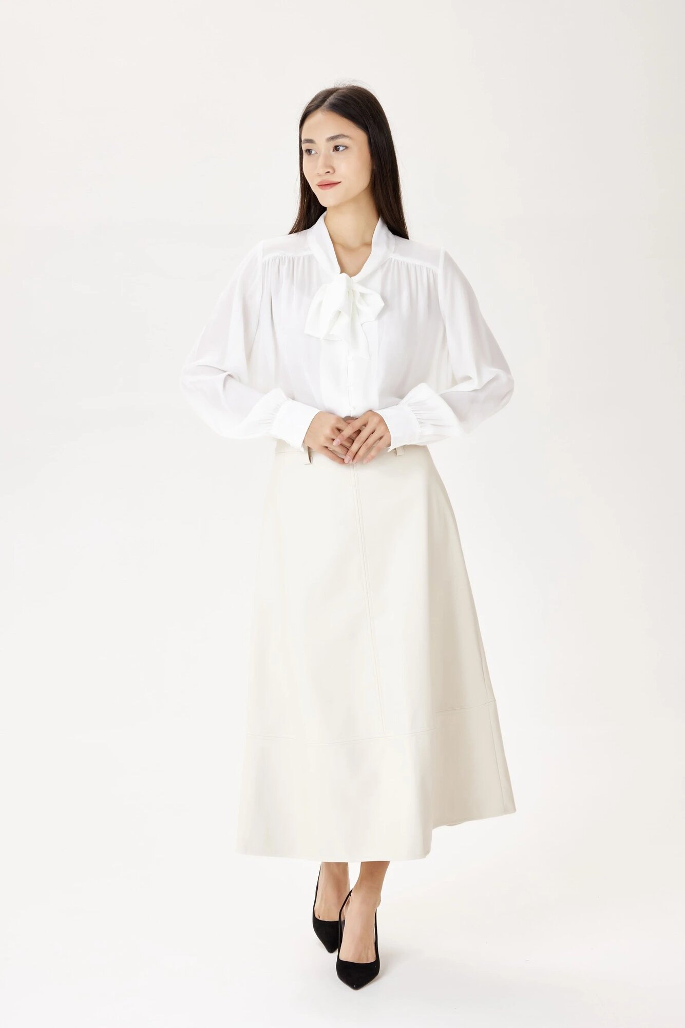 Нежная блузка свободного кроя с длинными рукавами, дополненная завязкой на шее. Универсальная модель для создания офисных и повседневных аутфитов, что также подчеркнет вашу женственность.