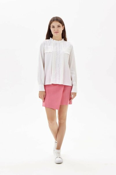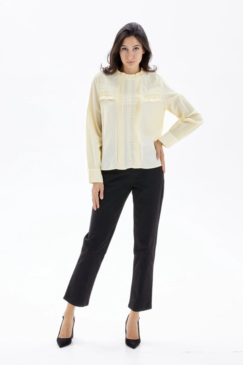 Легкая и нежная блузка с круглым вырезом. Модель прямого свободного кроя с длинными рукавами на манжетах. Декорирована оборками, плиссировкой и ажурной фурнитурой на всей передней части.