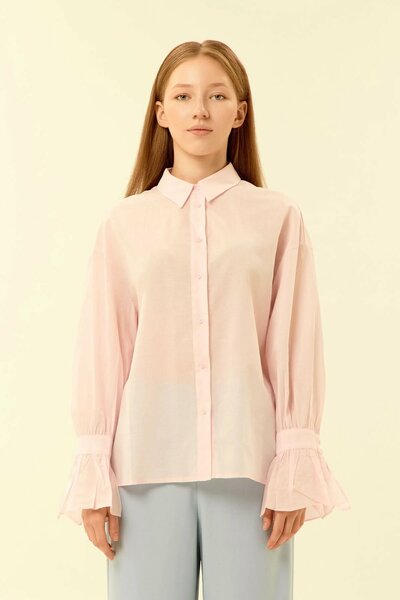 Блузка свободного кроя, выполненная из лёгкой и дышащей ткани, идеально подходит для создания стильных и комфортных образов. Классический отложной воротник и застёжка на пуговицы придают модели аккуратный и универсальный вид. Особое внимание привлекают рукава с объемом и манжетами на сборке, дополненные лёгкими оборками, которые добавляют женственности и изысканности силуэту. Благодаря прямому фасону блузка удачно сочетается как с классическими брюками и юбками, так и с джинсами, создавая множество вариантов для офиса и повседневных выходов.