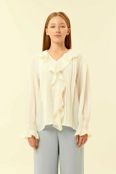 Блузка с изысканным дизайном, который сочетает романтичные детали и комфорт в носке. Центральная часть украшена мягкими вертикальными складками, визуально вытягивающими силуэт, а асимметричный волан с кружевной отделкой придаёт образу утонченность. Свободный крой обеспечивает удобство и подходит как для делового стиля, так и для повседневных сочетаний. Рукава на манжетах со сборкой и оборкой создают легкий акцент, а легкая ткань приятно ощущается на коже. Идеальный вариант для тех, кто ценит элегантность и практичность в одном изделии.