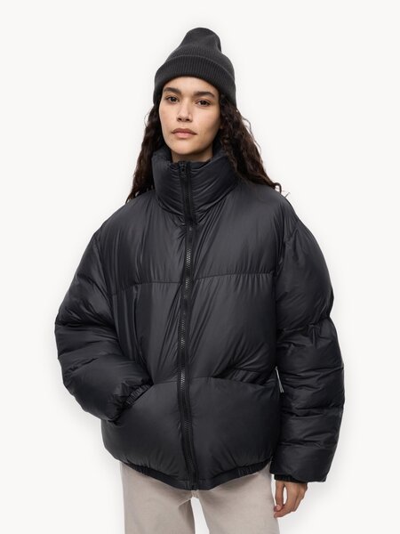 Куртка выполнена из мягкого нейлона с добавлением утеплителя DuPont™ Sorona® (450 г). Модель дополнена воротником-стойкой, что обеспечивает дополнительный комфорт и защиту от холода. У куртки есть два внешних кармана и один внутренний, все они закрываются на молнию. Резинка по нижнему краю и на манжетах защищает от ветра. Верх куртки изготовлен из матового тонкого нейлона. Силуэт оверсайз придаёт объёмность и свободу движений. Подкладка наружных карманов выполнена из флиса. Молнии SAB оснащены пуллерами. Состав: верхняя часть — 100% нейлон, подклад — 100% полиэстер.