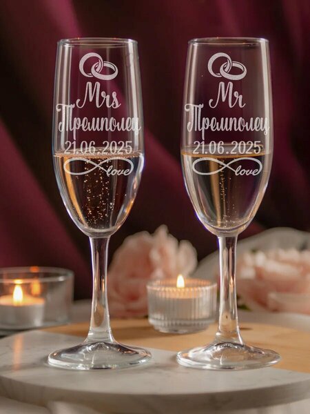 Свадебный набор бокалов для шампанского 2 штуки. Наши стеклянные фужеры для шампанского — это не только элегантное дополнение к вашему столу, но и уникальный способ выразить свои чувства. Набор из двух подарочных стаканов объёмом 250 мл. с прикольной необычной надписью станет прекрасным сувениром для свадьбы или другого особого события. Мы предлагаем возможность купить красивые именные бокалы или добавить дату (50 лет, хрустальная, ситцевая, золотая свадьба и т. д.), делая каждый глоток шампанского еще более запоминающимся. Наши фужеры под шампанское послужат оригинальным и запоминающимся презентом невесте и жениху для свадебного стола. Их можно презентовать как сюрприз для молодожёнов на саму свадьбу, годовщину брака для мамы, удивить любимую женщину, для подарка сестре Оле или близкой подруги Насти. Набор может выступить в роли самостоятельного подарка или стать приятным дополнением для основного презента. Такой комплект посуды подойдёт и для выездной регистрации брачного союза на природе. С бокалами можно устроить красивую и атмосферную фотосессию, которая запечатлеет важность момента для Вас. Они также будут украшать ваш дом при сервировке стола и напоминать о приятных и светлых моментах. Свадебный набор надёжно упакован в пупырчатую плёнку и картонную коробку. На бокалы нанесены интересные и прикольные надписи- «Король( K)» и «Королева( Q)», «Без ума от тебя», «Mr& Mrs», «Я люблю мужа» и «Я люблю жену», а также большой выбор изображений с силуэтами пар, обручальных колец и т. д. Наши наборы для шампанского не только олицетворяют изысканность и красоту, но и они идеально подходят для торжественных моментов, делая каждый миг особенным и незабываемым. Сделайте ваше торжество по-настоящему запоминающимся с оригинальными бокалами для шампанского с лазерной гравировкой. Подарите себе и вашим близким уникальные волшебные моменты, которые будут радовать сердца на многие годы вперед. Свадебные бокалы с именем, подарок на свадьбу