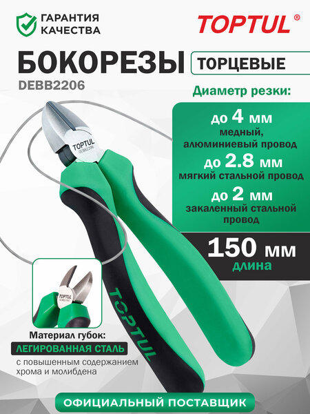 Бокорезы TOPTUL DEBB2206 – высококачественный профессиональный инструмент для точного и надежного разрезания различных типов проводов. Эти кусачки для проволоки и проводов являются незаменимым инструментом в работе с электроникой и электропроводкой. Режущая часть бокорезов изготовлена из прочной легированной стали с повышенным содержанием хрома и молибдена, что обеспечивает исключительную твердость и износостойкость. Благодаря этому бокорезы-кусачки обладают долгим сроком службы даже при регулярном интенсивном использовании. Короткие скошенные режущие кромки позволяют перекусывать проволоку у самого основания, что особенно важно при работе в труднодоступных местах и при необходимости точного разрезания. Эргономичные пластиковые рукоятки с антискользящим покрытием из резины обеспечивают комфорт и эффективность работы. Бокорезы-кусачки для проводов и кабеля TOPTUL DEBB2206 отличаются удобным захватом, благодаря чему инструмент надежно удерживается в руке, снижая вероятность случайных соскальзываний и повышая безопасность работы. Имея длину 150 мм, эти бокорезы для проволоки являются компактными и удобными в использовании, что позволяет легко маневрировать инструментом в ограниченном пространстве. Бокорезы TOPTUL DEBB2206 рассчитаны на разрезание различных типов проводов: медный и алюминиевый провод до 4 мм, мягкий стальной провод до 2,8 мм, закаленный стальной провод до 2 мм. Это делает их универсальными кусачками, подходящими для широкого спектра задач, связанных с электромонтажными работами и ремонтом электроники. Кусачки электрика TOPTUL DEBB2206 идеально подходят как для профессиональных специалистов, так и для домашнего использования. Бокорезы TOPTUL DEBB2206 – это качественный, производительный, надежный и удобный инструмент электромонтажника, специалиста по ремонту электроники, домашнего мастера.