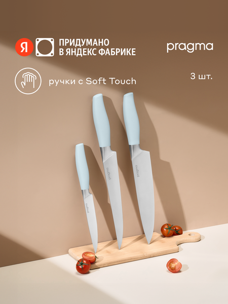Pragma — это бренд эстетичных и функциональных решений для дома, придуманный в Яндексе. ㅤ Pragma Bonbul — это набор ножей из нержавеющей стали для повседневной готовки. В комплект входят шеф-нож, универсальный нож и нож для чистки овощей. ㅤ Лезвия устойчивы к царапинам и ржавчине, до 6 месяцев остаются острыми без заточки. Удобная ручка с покрытием Soft Touch комфортно лежит в руке и не скользит. Ограничитель защищает пальцы во время нарезки. ㅤ Набор можно мыть в посудомоечной машине на эко-режиме при температуре не выше 60 °C и с моющими средствами с нейтральным pH. Дверцу машины стоит приоткрыть по окончании цикла для естественной сушки. При ручной мойке следует использовать только мягкую сторону губки, а затем протирать ножи сухой салфеткой — так ножи прослужат дольше.