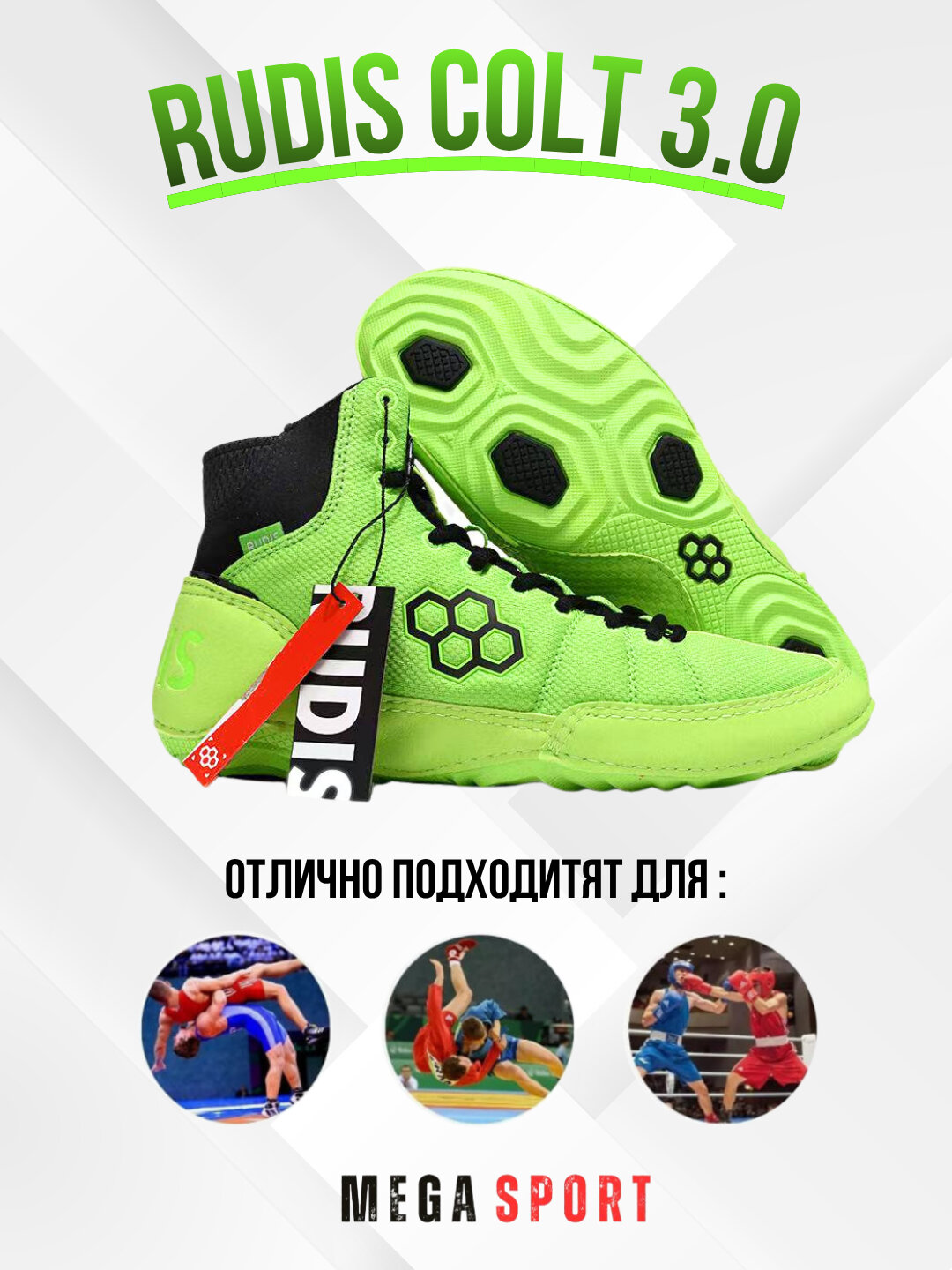 Борцовки Rudis Colt 3.0 зеленого цвета — профессиональная спортивная обувь, разработанная для борьбы, самбо и интенсивных тренировок. Модель сочетает в себе легкость, прочность и отличное сцепление с поверхностью, что особенно важно во время активной борьбы на ковре. Доступны размеры 41–45, что позволяет подобрать оптимальную посадку для спортсменов разного уровня подготовки.