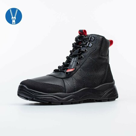 Ботинки в спортивном стиле имеют байковый утеплитель и предназначены для осенней и весенней погоды. Верх выполнен из гладкой натуральной кожи черного цвета. Классический язычок и манжет из текстиля обеспечивают отведение влаги во время активного движения. Подкладка из байки (больше 80% натуральная овечья шерсть) и съемная войлочная стелька хорошо сохраняют тепло. Молния обеспечивает максимальную раскрываемость модели при обувании, а шнуровка позволяет подогнать обувь по ноге и надежно её зафиксировать. Пяточная и носочная части защищены натуральной кожей с полиуретановым покрытием. Внутри защита пятки от трения - кожаная накладка поверх утеплителя. Модель разработана с учетом особенностей подростковой стопы и имеет элементы, которые обеспечивают правильную поддержку. Подошва из ПУ легкая и отлично подходит для долгих прогулок. Сделано в России.