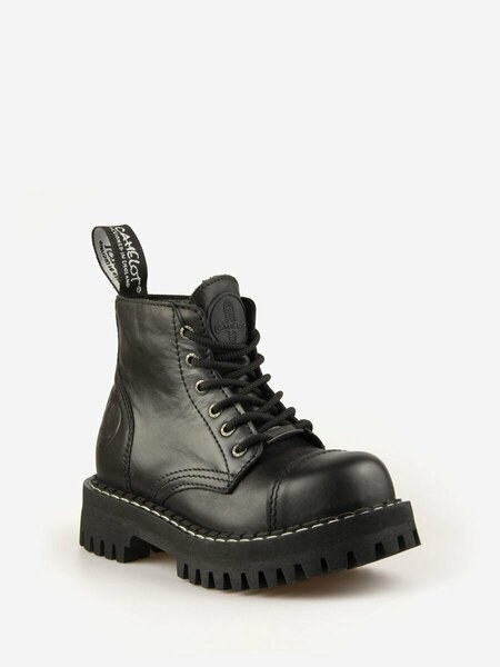 Ботинки Camelot К609 с металлическим подноском. Камелоты на 6 люверсов изготовлены из черной кожи КРС, застегиваются при помощи шнурков без молнии. Подкладка и стелька из натуральной кожи обеспечивают комфортную теплорегуляцию и необходимый воздухообмен. Подкладка в носочной части выполнена из байки. Высокая и прочная подошва ботинок Camelot состоит из верхнего PU слоя, который обеспечивает мягкость и удобство при ходьбе, и нижнего резинового слоя, который гарантирует качественное сцепление со всеми видами поверхностей и исключает возможность проникновения влаги. Подошва скреплена винтами. Высота подошвы в пятке 4см, в области мыса 3см. Модель большемерит на размер.