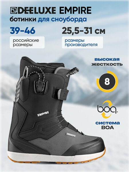 Сноубордические ботинки Deeluxe Empire – идеальный выбор для опытных райдеров, ищущих максимальную производительность и комфорт на самых сложных трассах. Асимметричная конструкция обеспечивает превосходное управление на любых поворотах, будь то быстрые или плавные. Подкладка Stage 4 гарантирует индивидуальную посадку, а язычок Freeride повышает прочность и гибкость ботинка. Система шнуровки L3 обеспечивает надёжную фиксацию и улучшенную реакцию. Японский журнал Freerun недавно назвал ботинки Deeluxe Empire лучшими для фрирайда, что подтверждает их высокое качество и характеристики. Жёсткость ботинка - 8/10 Ботинки с высокой Жёсткостью предназначены для любителей фрирайда и большой скорости. Такие ботинки чутко реагируют на малейшее движение ногой и дают максимальный контроль на доской. Термоформовка Внутренний сапожок выполнен из heat-moldable материала – при нагревании он становится гибким и мягким, а при остывании "запоминает" форму, которую ему придадут в нагретом состоянии. Правильно отформованный ботинок обеспечивает не только комфорт, но и высокую эффективность передачи усилия от ног к доске. Внутренник и подошва Stage 4 Благодаря точно подобранному анатомическому дизайну и изысканному карману на пятке, подкладка облегает контуры вашей стопы, обеспечивая при этом максимальную производительность. Внешняя обвязка пятки дополнительно удерживает ногу, обеспечивая исключительную фиксацию пятки. Remedy Прочная подошва отличается отличными амортизирующими свойствами, а её форма и цепкий протектор позволят совершать пешие переходы без лишней усталости в ногах. Шнуровка L3 Система шнуровки с двумя отдельными зонами и технологиями фиксации – одна удерживает голень, а другая лодыжку и пятку. Особенности: D-Tex Влагостойкая и дышащая мембрана, которая позволяет ноге оставаться в сухости и тепле. Powerstrap Липучка для дополнительной фиксации. Freeride Tongue Язычок Freeride Tongue увеличивает жёсткость ботинка от 8 до 10 при помощи Flex Booster позволяя изменять изгиб ботинка для конкретных условий катания. Asym Flex Этот дизайн предлагает райдеру повышенные жёсткость ботинка снаружи и мягкость внутри для мощного, но при этом вполне комфортного фрирайда. Sidekick Усиливающие элементы Sidekick – две зоны усиления: боковая и центральная для максимальной передачи усилия. Быстрее перекантовка, мощнее щелчок, а также меньшая вероятность травмы лодыжки Backbone Усиленный внешний задник ботинка для лучших прочности и отзывчивости.
