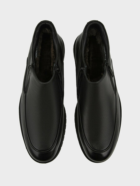 Ботинки мужские зимние натуральная кожа и натуральный мех классические без шнурков на молнии короткие выполнены в стиле дерби на толстой подошве 1,6 см и каблуке 3 см. Теплые черные казаки на черной подошве дополнены качественной фурнитурой. Изготовлены стильные утепленные полусапоги из натуральной кожи КРС черного цвета, мягкой и дышащей. Подкладка и съемная стелька из овечьего натурального меха в тон. Пятка внутри не утеплена. Подошва с неглубоким протектором из резины универсальная, упругая и износостойкая, с высокими противоскользящими свойствами, подходит практически для всех поверхностей, чищенных от снега дорог, не имеет приспособления от гололеда и наледи. Каблук моноблок надежный, литой с подошвой. Высота голенища 12 см. Обхват голенища 24 см. Мужская обувь Томас Мюнц полноты 6 комфортна на узкую ногу и средней полноты. Температурный режим для комфорта ног не ниже минус 20. Вес пары около 597 гр. Короткие сапоги зима подойдут как повседневные, свадебные, праздничные. Непромокаемая подошва защищает от снега и слякоти. Мягкие и легкие кожаные натуральные берцы на замке пригодятся как удобная основная и вторая обувь на зиму. Комфорты дышащие длинные полуботинки на высокой подошве с квадратным каблуком как теплая обувь для работы и в школу. Стильные рабочие и школьные ботинки для взрослых мужчин и подростков мальчиков обеспечивают комфорт. Брендовые ботинки для подростка мальчика и юноши могут подойти как туристические. Красивые мужские и подростковые ботинки для школьников легко заменяют полусапоги. Модные мужские и молодежные дерби с замком классика удобны для прогулки. Уличные ботинки на платформе небольшой высоты комфортны для ходьбы и в машину. Размерную сетку см. в фотографиях.