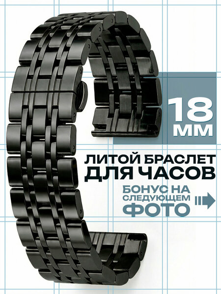 Элегантный литой стальной браслет для часов из нержавеющей стали с оригинальным плетением из цельнометаллических звеньев подходит для традиционных и умных смарт вотч часов, таких как Orient, Casio, Tissot, Seiko, Garmin, Huawei, Amazfit, Honor и многих других с шириной крепления к корпусу (расстояние между "ушками") - 18мм. Будьте внимательны при определении нужного размера! Идеально гладкая поверхность. Металлический ремешок для часов имеет раскладную застежку - клипсу-бабочку с боковыми фиксаторами, невидимую с внешней стороны. Укорачивание браслета производится путем снятия звеньев - по 3 штуки с каждой стороны. Штифты удаляются только в одну сторону (смотри инструкцию на фото). Инструмент для самостоятельного снятия звеньев, шпилесъемник металлический двусторонний, 2 быстросъемные и 2 обычные шпильки, а также 2 оконцовки, которые закрывают просвет между браслетом и круглым корпусом часов, идут в комплекте: Вам не понадобится часовой мастер. Ремень шириной - 18mm. Толщина - 3,8 мм, длина в закрытом состоянии - 185 мм. Вес - 80 грамм. Аксессуар усилит любой Ваш образ и будет отлично смотреться в сочетании как с деловым костюмом, так и с повседневной, модной или спортивной одеждой. Товар поставляется в брендированной коробке, поэтому идеально подойдет в качестве подарка на любой праздник - мужской и женский.