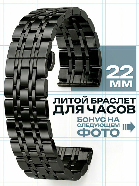 Элегантный литой стальной браслет для часов из нержавеющей стали с оригинальным плетением из цельнометаллических звеньев подходит для традиционных и умных смарт вотч часов, таких как Orient, Casio, Tissot, Seiko, Garmin, Huawei, Amazfit, Honor и многих других с шириной крепления к корпусу (расстояние между "ушками") - 22мм. Будьте внимательны при определении нужного размера! Идеально гладкая поверхность. Металлический ремешок для часов имеет раскладную застежку - клипсу-бабочку с боковыми фиксаторами, невидимую с внешней стороны. Укорачивание браслета производится путем снятия звеньев - по 3 штуки с каждой стороны. Штифты удаляются только в одну сторону (смотри инструкцию на фото). Инструмент для самостоятельного снятия звеньев, шпилесъемник металлический двусторонний, 2 быстросъемные и 2 обычные шпильки, а также 2 оконцовки, которые закрывают просвет между браслетом и круглым корпусом часов, идут в комплекте: Вам не понадобится часовой мастер. Ремень шириной - 22mm. Толщина - 3,8 мм, длина в закрытом состоянии - 185 мм. Вес - 100 грамм. Аксессуар усилит любой Ваш образ и будет отлично смотреться в сочетании как с деловым костюмом, так и с повседневной, модной или спортивной одеждой. Товар поставляется в брендированной коробке, поэтому идеально подойдет в качестве подарка на любой праздник - мужской и женский. Совместим со следующими моделями часов с шириной крепления 22 мм: