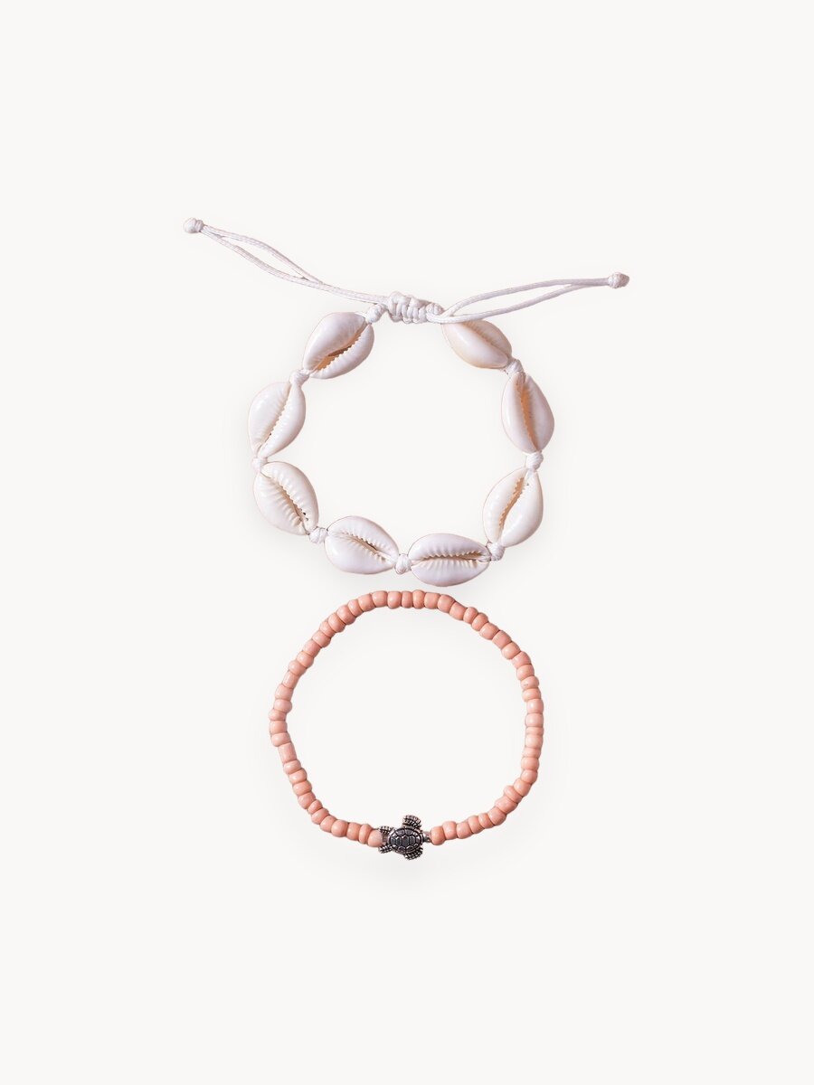 Достоинства:Маленькие, миленькие. Недостатки:Нет Комментарий:Ракушечки крепкие, как-будто покрыты глазурью. Браслетик с ракушками регулируется, а браслетик с черепашкой на резинке.
