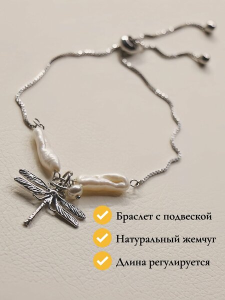 Элегантный браслет, созданный из высококачественного металла с родиевым покрытием, которое придаёт украшению благородный блеск и защищает поверхность от потускнения. Акцент украшения — изящная подвеска в форме стрекозы, дополненная двумя жемчужинами натурального происхождения. Каждая жемчужина имеет уникальную форму, что делает изделие по-настоящему неповторимым. Особенности: • Материал основы: высококачественный ювелирный сплав с родиевым покрытием • Вставки: натуральный барочный жемчуг • Подвеска: стрекоза из металла с детализированной фактурой • Тип застёжки: регулируемый бегунок для точной подстройки по запястью Преимущества: • Родиевое покрытие повышает износостойкость и обеспечивает зеркальный блеск • Регулируемая длина делает браслет комфортным и универсальным • Барочный жемчуг добавляет характер и уникальность изделию • Отлично подходит для повседневного образа и в качестве подарка