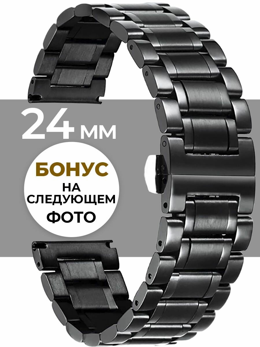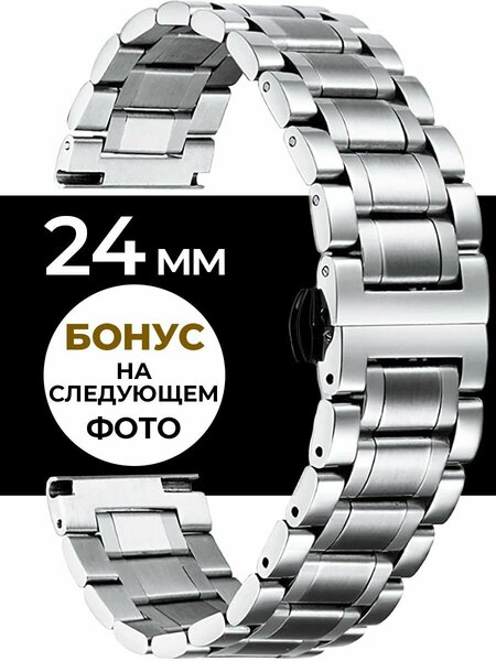 Массивный браслет для часов из нержавеющей стали с цельнометаллическими звеньями. Центральная часть - сатинированная (матовая), по краям - полированные звенья. Ремешок для часов имеет идеально гладкую поверхность. Браслет имеет раскладную застежку - клипсу-бабочку с боковыми фиксаторами, невидимую с внешней стороны. Укорачивание браслета производится путем снятия звеньев - по 3 штуки с каждой стороны. Эта модель солидно лежит в руке и ощущается на запястье. Ремешок для часов 24 мм не царапает руку, не дергает волоски и не вызывает зуда и потливости на руке. В комплект входят: ремень, шпилесъемник металлический двусторонний, инструмент для регулировки длины, 2 быстросъемные и 2 обычные шпильки, 2 оконцовки для крепления к круглому корпусу, которые закрывают просвет между браслетом и корпусом часов. Товар поставляется в брендированной коробке, поэтому идеально подойдет в качестве подарка на любой праздник - мужской и женский.