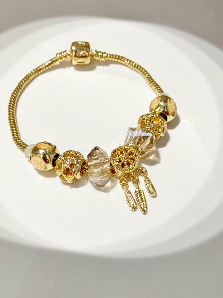 Браслет «Золото Пандора» — это очаровательное украшение, созданное для тех, кто ценит стиль и нежность. Основание выполнено из прочного металлического сплава с изысканным золотым покрытием, которое придаёт изделию роскошный блеск. Браслет украшен оригинальными подвесками, среди которых выделяется фигурка мишки, инкрустированная прозрачными кристаллами. Комбинация глянцевых бусин и декоративных элементов делает этот аксессуар выразительным и уникальным. Он идеально подойдёт как для повседневного образа, так и для праздничных случаев, подчеркивая индивидуальность и утончённый вкус своей обладательницы.