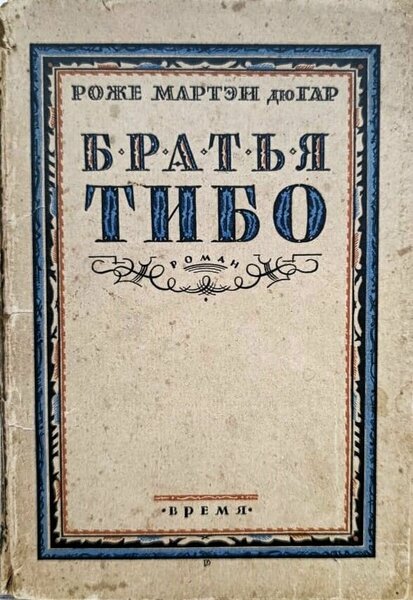 Кооперативное издательство «Время» Ленинград. Действие романа Роже Мартена дю Гара «Семья Тибо» происходит в начале XX века. Перевод с французского Н. Рыковой и Е. Коц. Под редакцией А. А. Смирнова. «Братья Тибо» — роман французского писателя Роже Мартена дю Гара, изданный в 1929 году в издательстве «Время» (Ленинград). Действие романа происходит в первой четверти прошлого века, накануне и во время Первой мировой войны. Книга рассказывает о жизни двух братьев — Жака и Антуана, сыновей богатого, очень властного и деспотичного буржуа Оскара Тибо. Они выросли без матери, а отец не сумел дать им настоящей любви и заботы. Антуан — рассудительный, спокойный, добропорядочный человек, врач. Жак — революционер и по натуре, и по жизни. Он бунтует с самого детства, сбегает из дома, ищет свободы, независимости и справедливости. Замысел романа раскрывается в сопоставлении судеб двух братьев — Антуана и Жака. В их судьбах — конфликт двух путей: успех, примирение или бунт и разрыв.