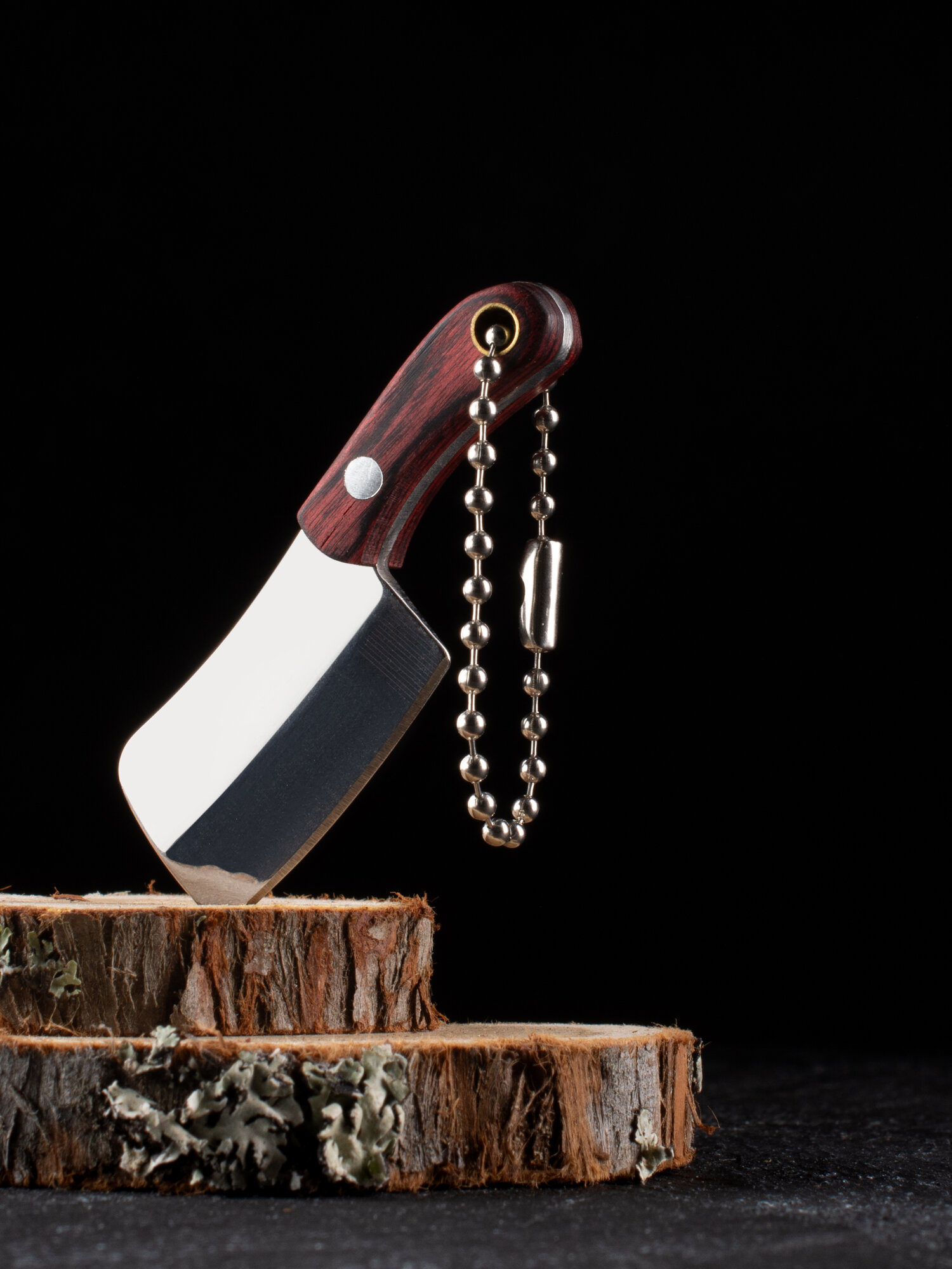 Настоящий кухонный топорик, выполненный в миниатюрном размере в виде брелока. Общая длина ножа составляет всего 60 мм. Длина лезвия ножа 32 мм. Длина рукоятки 28 мм. Вес ножа около 10 г. Рукоятка ножа выполнена из натурального дерева палисандр (розовое дерево). Лезвие ножа выполнено из нержавеющей стали 5CR15, твердостью 56-58 HRC. На лезвие ножа нанесен лазерный рисунок, повторяющий рисунок дамасской стали. В комплектацию ножа входит чехол из искусственной кожи. Внимание: обращение с аксессуаром требует осторожности, кромка лезвия острая. Беречь от детей.