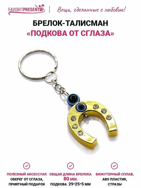Мелочей в образе не бывает, поэтому внимание требуют даже брелоки для ключей. Как приятно открывать дверь любимого дома, машины или офиса (да в общем, абсолютно любую дверь) ключом с красивым брелоком, отвечающим Вашему настроению! Представление о том, что подкова приносит счастье и удачу, пришло из Древнего Египта. По легенде, лошадей для колесниц фараона подковывали золотыми подковами, и за мчащимися колесницами неслась толпа в надежде на то, что подкова из золота достанется счастливцу. Подарите удачу себе и близким, и пусть она всегда будет рядом! Брелок-талисман Подкова от сглаза - лучший подарок на любые случаи жизни, подходит для маленьких поводов и больших торжеств, уникален и универсален! Кроме того, благодаря вставке глаза Фатимы - это прекрасный оберег от сглаза. Глаз Фатимы - уникальный оберег, который имеет невероятную силу. Обладает защитными свойствами и является незаменимым помощником в трудных жизненных ситуациях. Оберег отлично справляется с любым негативом, отражая от себя и магические атаки, и происки недоброжелателей. Чаще всего его используют для того, чтобы защититься от сглаза, порчи и проклятий. Иногда его носят, чтобы оградить себя от неприятностей и несчастных случаев, да и просто, чтобы защититься от негативной энергии, идущей от окружающих. Большинство амулетов носят скрытыми от посторонних глаз. Глаз Фатимы является исключением - он работает, когда находится на видном месте.