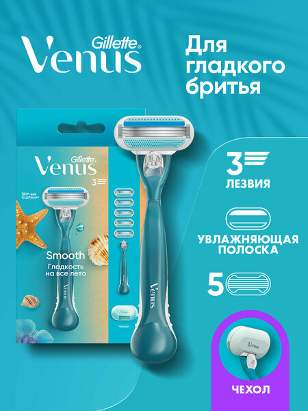 Бритвенный станок Venus Smooth от Gillette предназначен для женского ухода за телом. В комплект входит четыре сменных лезвия, что обеспечивает длительное использование без необходимости частой замены. Станок оснащен чехлом, что делает его удобным для хранения и транспортировки.