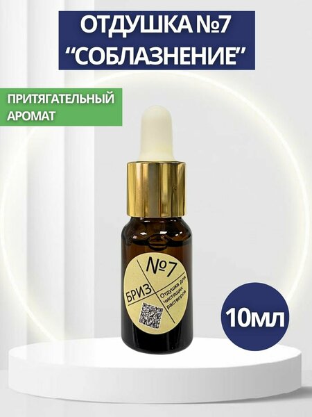 Бриз №7 — отдушка “Соблазнение”, 10 мл Отдушка «Соблазнение» — это выразительная ароматическая композиция с яркими цитрусовыми, свежими пряными и нежными травяными аккордами. Аромат создаёт ощущение энергии, чистоты и лёгкости, раскрываясь постепенно и многослойно. Верхние ноты дают динамичный и освежающий старт: лемонграсс, мате, мандарин и виноград создают сочное, искристое звучание. В сердце аромата — тёплый и мягко пряный кардамон, придающий глубину и утончённость. Шлейф формируют нежная пудра, сладковатая ваниль и чистый белый мускус, добавляющие композиции воздушность и обволакивающую мягкость. Отдушка идеально подходит как для бытового, так и для профессионального применения, добавляется в моющие составы и не влияет на их эффективность. После высыхания не оставляет липкости и формирует лёгкий, ненавязчивый аромат. Особенности и преимущества: • яркие цитрусовые и свежие пряные аккорды • сложное многослойное раскрытие аромата • сочные верхние ноты (лемонграсс, мате, мандарин, виноград) • пряное сердце — кардамон • мягкий шлейф из пудры, ванили и белого мускуса • универсальна: подходит для профессионального и домашнего использования • после высыхания не оставляет липкости Применение: • 5–10 капель на 10 литров раствора для лёгкого ароматического эффекта • можно добавлять в воду, кислотные ополаскиватели и щелочные моющие средства • перед использованием рекомендуется перемешать раствор