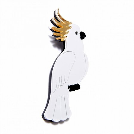 Белоснежный Какаду с золотистым хохолком. Размер в мм: 80x37 Вес в гр: 10 В MONOLAMA мы создаем смелые и актуальные украшения, вдохновляясь современным искусством. Мы придумываем их такими, какие любим носить сами – красивыми и необычными, видя которые, люди на улицах улыбаются и спрашивают: "Что это и где такое взять?". Органическое стекло (другое название "акрил", "оргстекло") - это наш любимый материал. Оно легкое и прочное - недаром его используют для изготовления люков в самолетах!