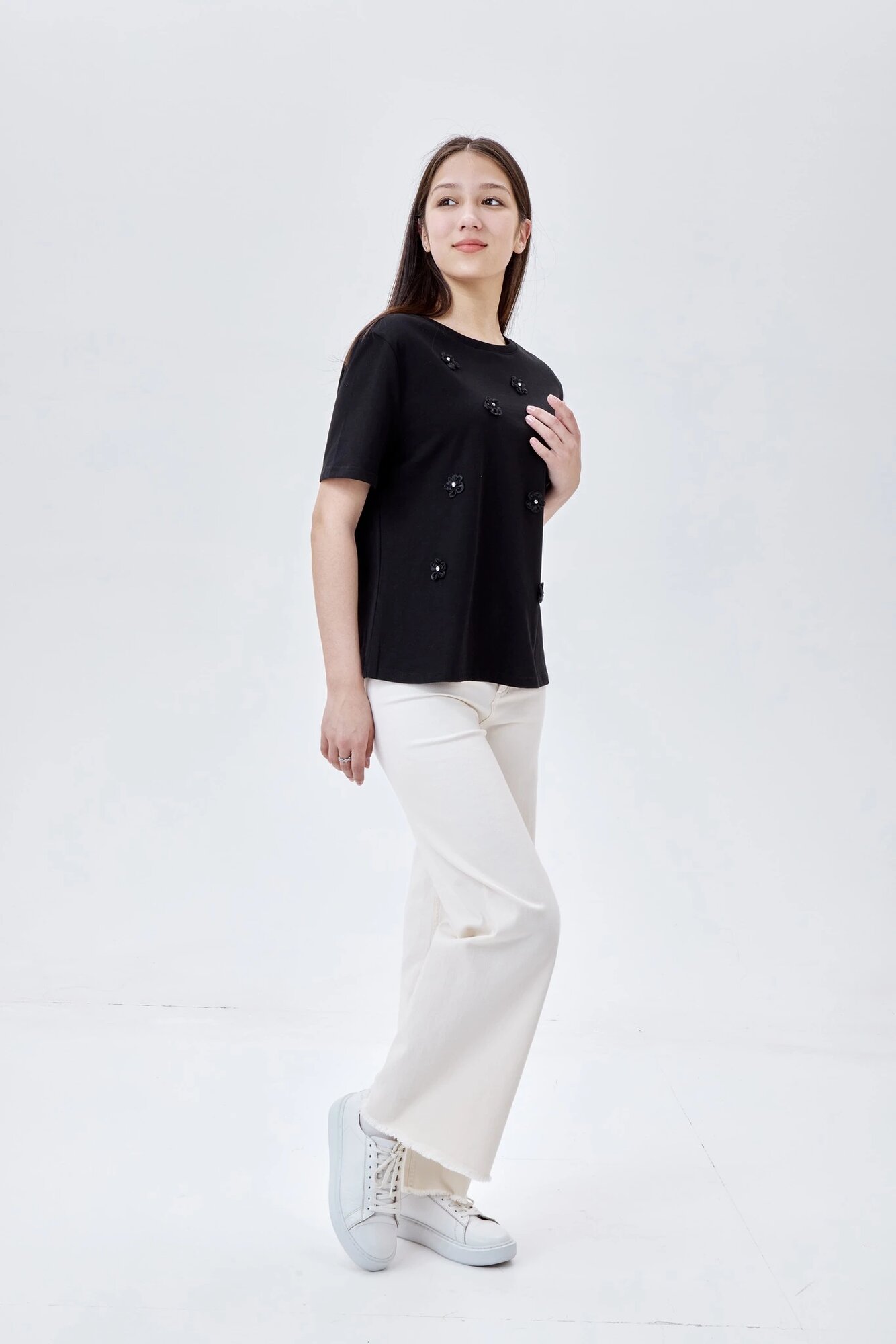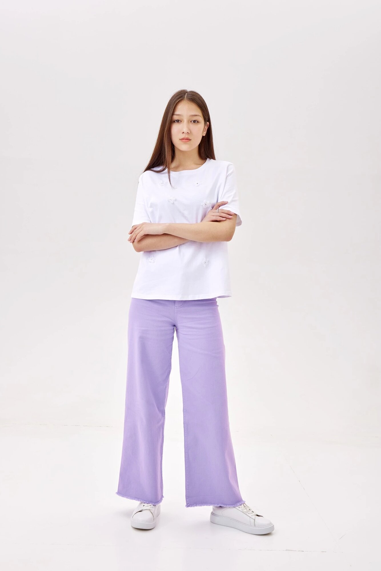 Брюки с необработанным низом на высокой посадке. Имеют два задних кармана и застежку на молнию с пуговицей. Универсальная модель для образов в уличном и кэжуал стилях.