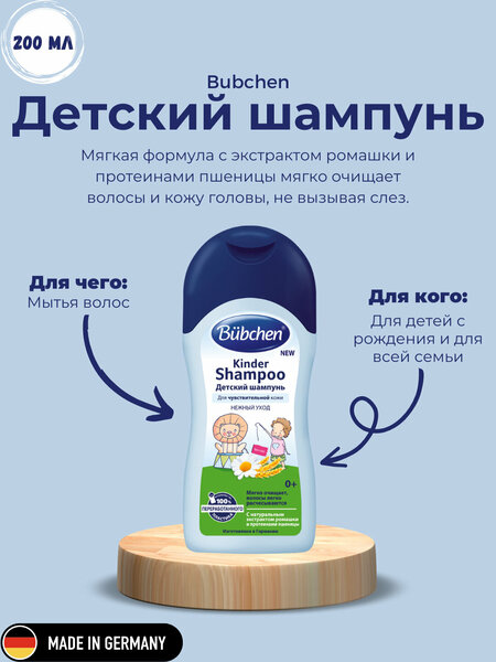 bchen детский шампунь – 200 мл / 400 мл (3 варианта) Детский шампунь Bübchen создан специально для бережного ухода за волосами и кожей головы малышей. Немецкое качество и мягкая формула обеспечивают деликатное очищение без раздражения глаз. Подходит для ежедневного применения. Шампунь помогает сохранить естественный баланс кожи, делает волосы мягкими, шелковистыми и легко расчёсываемыми. Не содержит агрессивных компонентов. Варианты объёма: 200 мл – удобно брать с собой 400 мл – экономичный формат для длительного использования (3 варианта – для разных возрастов и потребностей) ✨ Преимущества: Формула без слёз Подходит для чувствительной кожи Лёгкий приятный аромат Дерматологически протестирован Немецкое качество
