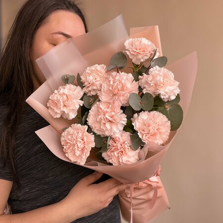 Элегантный монобукет из нежных кремовых гвоздик (диантусов), украшенный веточками эвкалипта, - идеальный комплимент для особого случая. Нежный оттенок цветов добавляет романтичности, а утонченное сочетание гвоздики и эвкалипта придает букету изысканность. Прекрасный выбор для выражения своих чувств и пожеланий, этот букет станет прекрасным украшением и приятным сюрпризом для вашего близкого человека. К каждому букету мы прикладываем фирменный конверт, в котором находятся: инструкция по уходу за букетом пакетик с подкормкой сладкий подарок