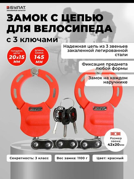 Замок для велосипеда с цепью в 3 звена 0,4 м. Булат ВС 005Ц Уникальная форма противоугонки для любого малого движимого транспорта или необычный подарок велосипедисту. Предназначен для защиты велосипеда, электровелосипеда, детской коляски, ворот, самоката, электросамоката, снегоката, лодки, снегоката, санок и другой малогабаритной техники. Велосипедный замок обладает преимуществами: - Подходят под диаметр рулевой стойки большинства самокатов - Усиленные звенья цепи - Внутренний диаметр наручника- 75мм. - Фиксация предмета любой формы - Наручники покрыта мягкой резиной для избежание царапин охраняемого объекта. Технические характеристики: Материал корпуса замка: сталь в пластиковом кожухе Материал цепи: Закаленная легированная сталь Материал ключа: Сталь, пластик. Толщина цепи: 1,5мм Длина цепи: 145мм Вес замка: 1,1 кг Замок на каждом наручнике: с цилиндровым механизмом. Запирание: Не автоматическое Цвет: Красный Секретность: 3 класс Перфоключ: 3шт Комплектация: Цепь с замком, 3 ключа. ловиях.