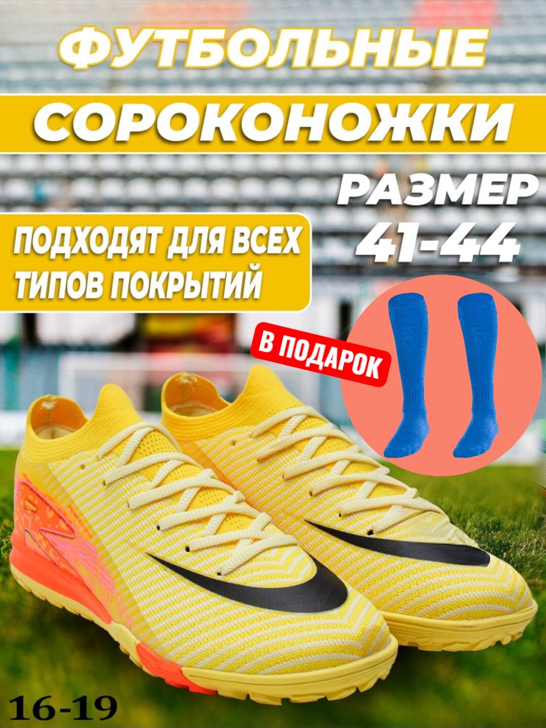 Футбольные бутсы - легкая и удобная экипировка, которая подойдет не только для игры в футбол, но и для баскетбола, тенниса, фитнеса и бега. Качественную обувь отличает противоскользящая технология с повышенным сцеплением - подошва из термопластичной резины не боится скольжения на мокрой траве. Модель выполнена из кожаного материала (искусственная кожа), дополнена высоким верхом из прочного трикотажа для защиты щиколотки, а амортизирующая резиновая подошва со специальным рельефным рисунком - протектором обеспечивает максимальное сцепление с поверхностью поля. Долговечные и качественные, прочные и дышащие материалы с легкостью выдерживают интенсивное использование во время тренировок. Для фиксации стопы и идеальной посадки бутс по ноге используется шнуровка, а мягкая трикотажная манжета плотно облегает ногу. Модные «сороконожки» в ярким дизайне и подходящем размере от 40-го до 44-го дополнят гардероб взрослых мужчин или парней - подростков, станут отличным выбором обуви для тренировок в спортзале или на спортивной площадке, на улице, будут удобны для ношения в летний и демисезонный период. Тренировочные бутсы с фиксацией на шнурках будут максимально удобны для мини - футбола, их также выбирают для школьного урока физкультуры в дополнение к спортивной форме, для занятий на уличных тренажерах. Эффектная часть экипировки футболиста подойдет и профессиональным игрокам, и любителям, станет хорошим супер - подарком для сына - школьника или лучшего друга на любой праздник, в т. ч. юбилей.