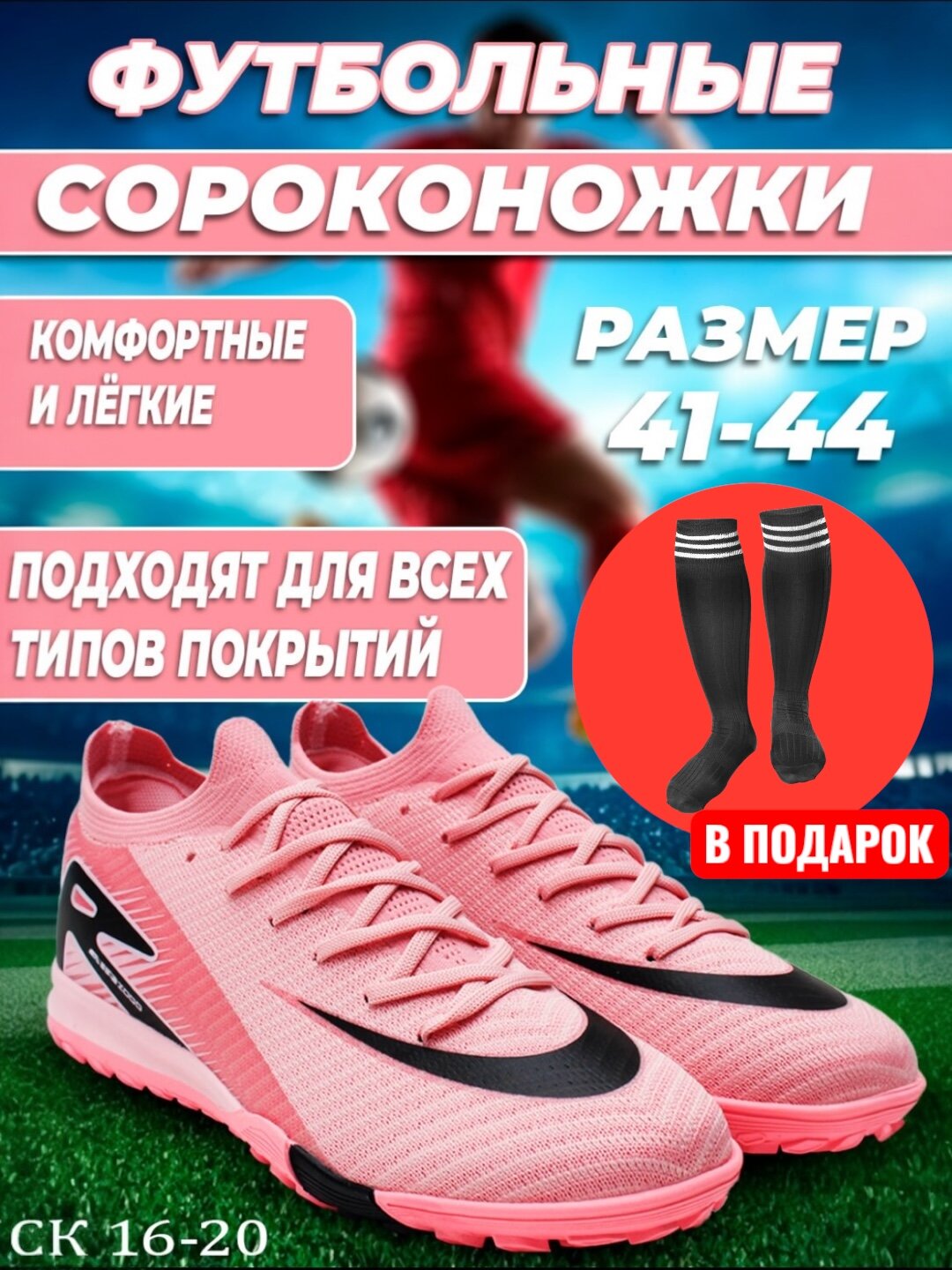 Футбольные бутсы - легкая и удобная экипировка, которая подойдет не только для игры в футбол, но и для баскетбола, тенниса, фитнеса и бега. Качественную обувь отличает противоскользящая технология с повышенным сцеплением - подошва из термопластичной резины не боится скольжения на мокрой траве. Модель выполнена из кожаного материала (искусственная кожа), дополнена высоким верхом из прочного трикотажа для защиты щиколотки, а амортизирующая резиновая подошва со специальным рельефным рисунком - протектором обеспечивает максимальное сцепление с поверхностью поля. Долговечные и качественные, прочные и дышащие материалы с легкостью выдерживают интенсивное использование во время тренировок. Для фиксации стопы и идеальной посадки бутс по ноге используется шнуровка, а мягкая трикотажная манжета плотно облегает ногу. Модные «сороконожки» в ярким дизайне и подходящем размере от 40-го до 44-го дополнят гардероб взрослых мужчин или парней - подростков, станут отличным выбором обуви для тренировок в спортзале или на спортивной площадке, на улице, будут удобны для ношения в летний и демисезонный период. Тренировочные бутсы с фиксацией на шнурках будут максимально удобны для мини - футбола, их также выбирают для школьного урока физкультуры в дополнение к спортивной форме, для занятий на уличных тренажерах. Эффектная часть экипировки футболиста подойдет и профессиональным игрокам, и любителям, станет хорошим супер - подарком для сына - школьника или лучшего друга на любой праздник, в т. ч. юбилей.