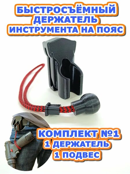 Комплект № 1: 1 держатель 1 подвес Освободите руки! Быстросъемный держатель, крепление инструментов на пояс, стремянку, стену. – незаменимый помощник для профессионалов и любителей. Изготовлен из пластика petg, методом 3D печати, для максимальной прочности и долговечности. Компактный дизайн позволяет заменить большую сумку и носить инструменты на ремне, не стесняя движений. Идеален для монтажников, слесарей, сантехников, электриков, и просто для тех, кому важен комфорт, мобильность и доступность инструментов под рукой: шуруповерт, дрель, перфоратор, гайковерт и т. д. Строительная сумка во многих случаях становится не нужна. * Добавляет комфорта во время использования электрического, аккумуляторного или ручного инструмента, освобождает руки, за счет чего повышается эффективность, минимизируется усталость, повышается скорость выполнения работ. * Держатель легко крепится на ремень, не прибегая к расстёгиванию или снятия его. * Продуманная конструкция с усилением нагруженных мест * Возможность использования как на поясе, так и закрепить саморезами к стремянке, на стену или другую вертикальную поверхность в месте проведения работ. * Надежная фиксация держателя на поясе. * Возможно использовать на узких и широких поясах (до 6 см.). * Нагрузка до 15 кг. * Подвес-петля «шар» обеспечивает легкий заброс на держатель, так же как и его съем. * «Ползунок» на шнуре страхует от случайного ослабевания петли. * Скругленные плавные грани – защита от травматизма. * Крепкий пластик PET-G, температура использования до 80 градусов Цельсия. Производитель оставляет за собой право, без предварительного уведомления, вносить изменения в конструкцию, комплектацию, цвет, технологию изготовления изделия. Изделие относится к товарам для личного пользования. Продавец (производитель) не несет ответственности за возможный ущерб, возникший в процессе использования товара, включая прямой, косвенный, случайный, побочный. Товар не подлежит обязательной сертификации.