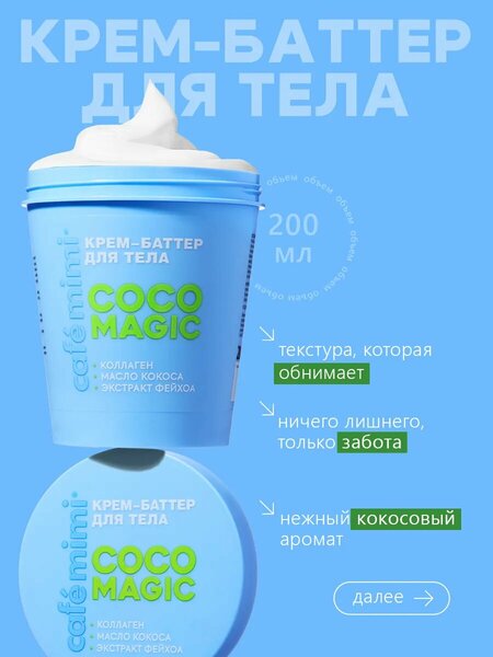 Cafe Mimi COLOURS представляет крем-баттер для тела COCO MAGIC, который обладает плотной текстурой и мгновенно тает на коже. Крем-баттер глубоко питает, увлажняет и смягчает кожу, делая ее мягкой, шелковистой и красивой. Активные ингредиенты, такие как масла ши и кокоса, восстанавливают, питают и увлажняют кожу, возвращая ей мягкость и гладкость. Коллаген разглаживает микрорельеф кожи, повышает упругость и эластичность, а экстракт фейхоа тонизирует и стимулирует процессы регенерации клеток кожи. Особенностью крема-баттера является его состав без минеральных масел, парабенов, красителей и с активными ингредиентами, такими как растительное масло, масло ши и масло кокоса. Способ применения прост: нанесите крем-баттер легкими массажными движениями на чистую сухую кожу. Используйте его для дневного ухода, массажа и восстановления кожи. Объем крема-баттера составляет 200 мл, что делает его экономичным и удобным в использовании.