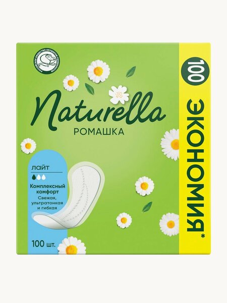 Naturella предлагает ежедневные прокладки Camomile Light daily с ароматом ромашки. Эти прокладки обеспечивают комфорт и свежесть каждый день. В упаковке содержится 100 штук, что делает их удобным выбором для длительного использования. Толщина прокладок составляет всего 0,9 мм, что делает их практически незаметными при ношении.